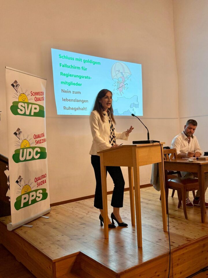 “I consiglieri di Stato hanno una grande responsabilità e hanno il diritto di percepire un buono stipendio. Tuttavia, è inaccettabile che ricevano oltre le indennità dell’AVS e della cassa pensione anche un vitalizio di ben oltre 100.000 franchi all’anno dopo il loro mandato. Poiché il Gran Consiglio si è rifiutato di porre fine a questa pratica desueta, l’UDC deve ora sottoporre la proposta al popolo”, ha affermato con chiarezza la deputata poschiavina Gabriela Menghini.